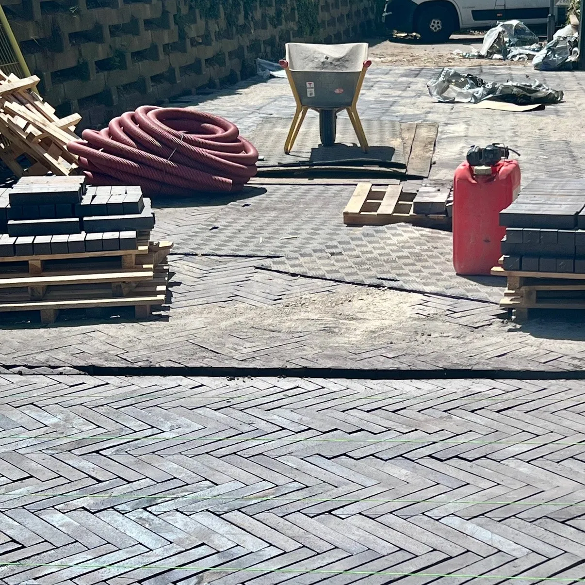 De gamle belægningssten nedknuses og genbruges et andet sted. De nye belægningssten er klinker, og vil holde i betydeligt flere år end betonsten.