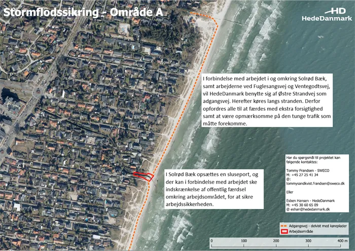 I 2023 har Solrød Kommune i samarbejde med kommunens rådgiver, Sweco A/S, projekteret og udbudt de resterende arbejder til sikring af Solrøds kyststrækning i område A mod stormflodsoversvømmelser.