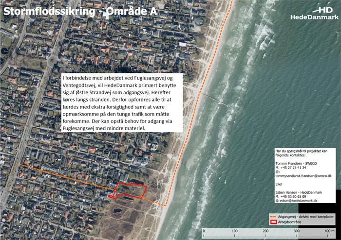 Det er HedeDanmark, der skal stå for etableringen af den resterende kystsikring. Allerede nu er forberedelserne til arbejdet i gang. På kortet herunder kan det ses, hvor anlægsarbejdet vil finde sted, og hvor der vil være afspærringer og forhindringer for færdsel de kommende tre måneder.