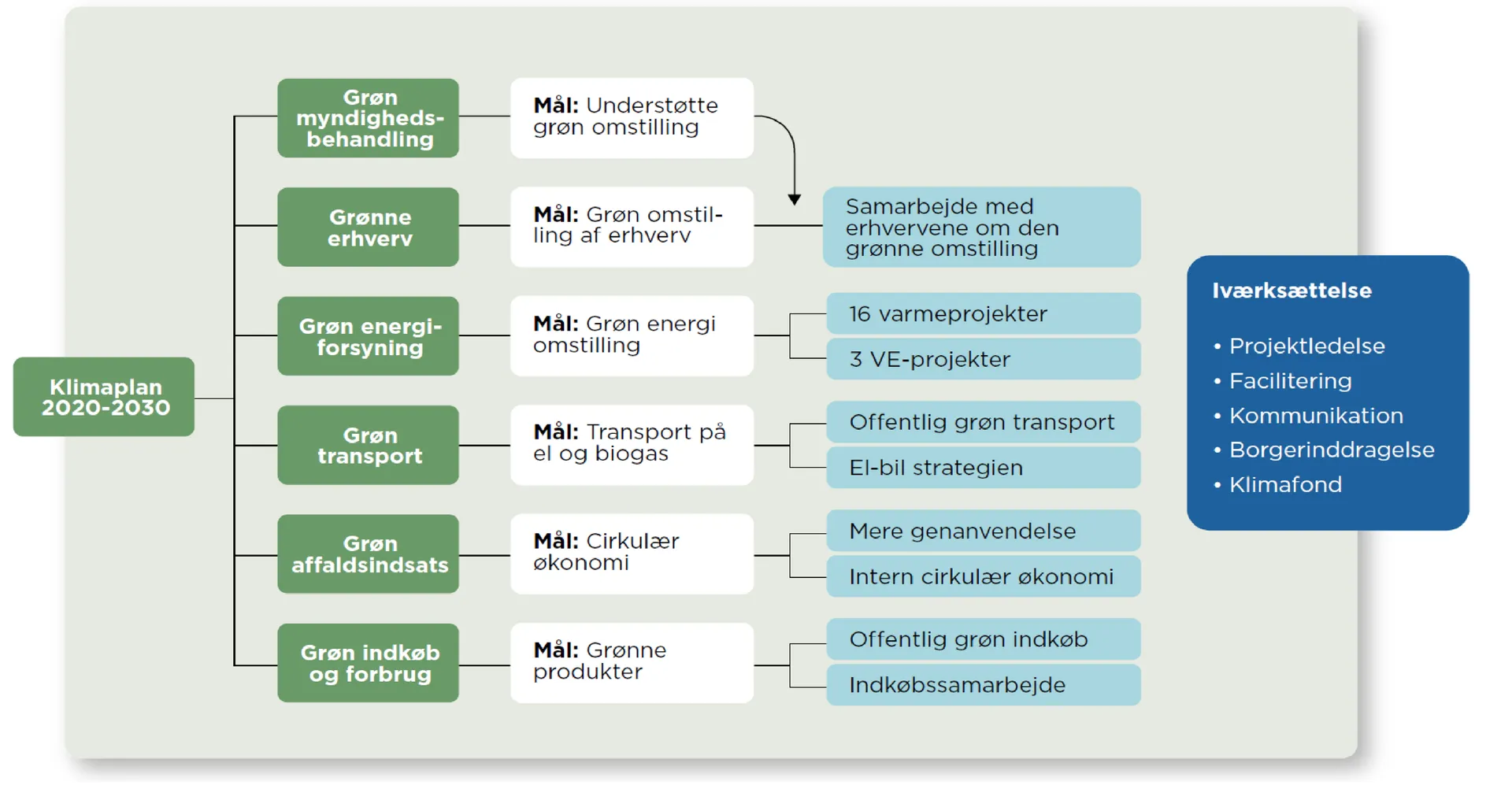 For at sikre opfyldelse af målene er der i planen fremlagt en række forskellige projekter. Det indebærer bl.a. udfasning af gasfyr, opførsel af vedvarende energi, klimatilpasning af regnvandssystemer, kystsikring og etablering af mere vild natur. Til sammen vil projekterne mindske udledningen af drivhusgasser, bidrage til at mindske klimaforandringerne og gøre kommunen mere robust mod konsekvenserne af klimaforandringerne.