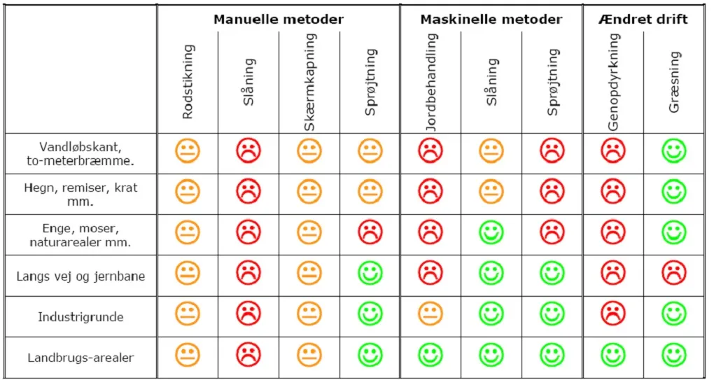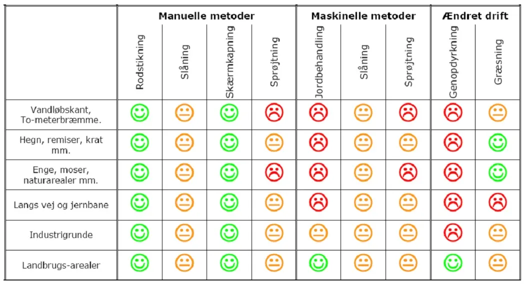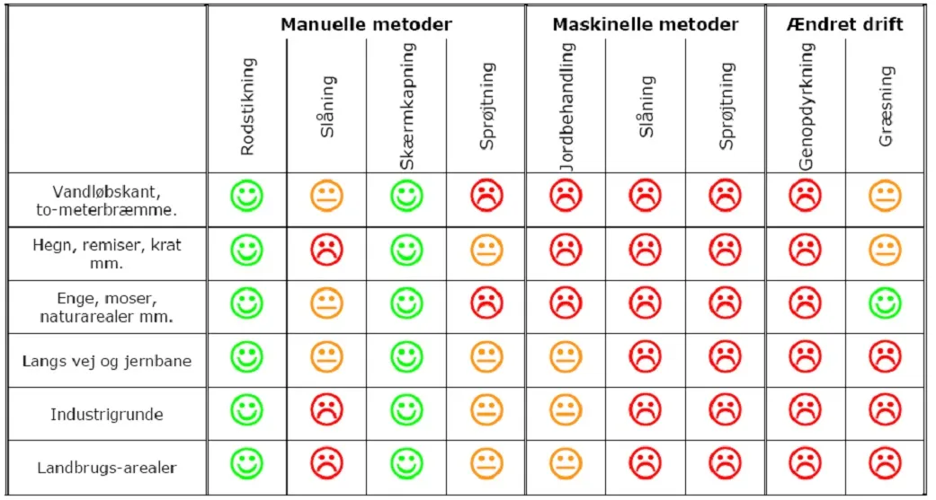 Herunder er vist tre skemaer, der kan give et overblik over, hvilke bekæmpelsesmetoder der er bedst egnet afhængig af bestandsstørrelse og lokation, når man ønsker at komme af med Kæmpebjørneklo.