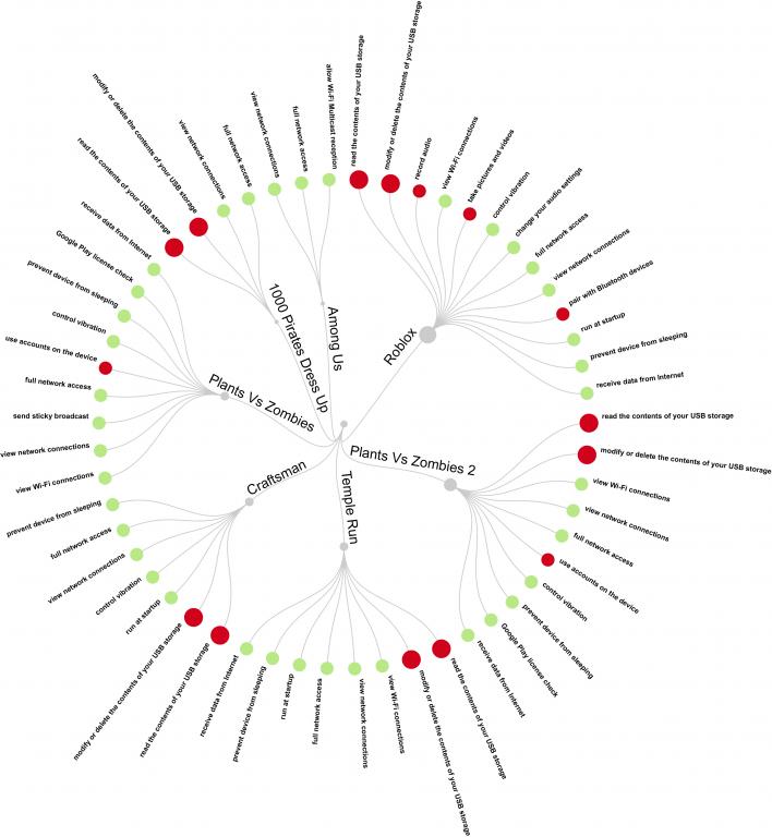 Illustrationerne herunder tager udgangspunkt i en femårig dreng og viser de forskellige gratis spilapps, han bruger. På billede 1 ses de forskellige adgange og tilladelser, som disse apps beder om for at indsamle data (fx brug af mikrofon).